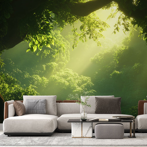 WonderMuralTento impozantní fotomurál zobrazuje kouzelný les, kde sluneční paprsky pronikají hustým listím, vytvářející uklidňující a přírodní atmosféru. Tóny...