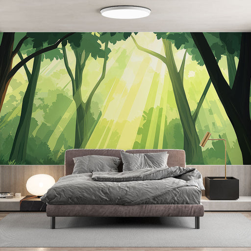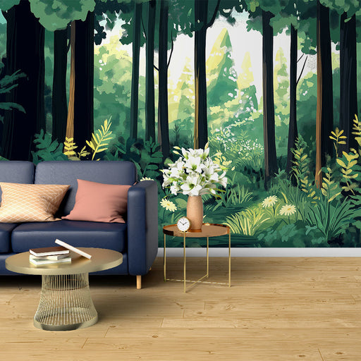 WonderMuralTato tapeta představuje nádherný bujný les, kde vysoké stromy stojí půvabně na koberci z jasně zelené vegetace. Živé odstíny zelené a doteky světla...