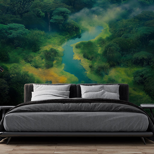 WonderMuralTato tapeta nabízí nádherný letecký pohled na bujný les obklopující klidnou řeku. Odstíny zelené a odrazy vody vytvářejí uklidňující a pohlcující a...