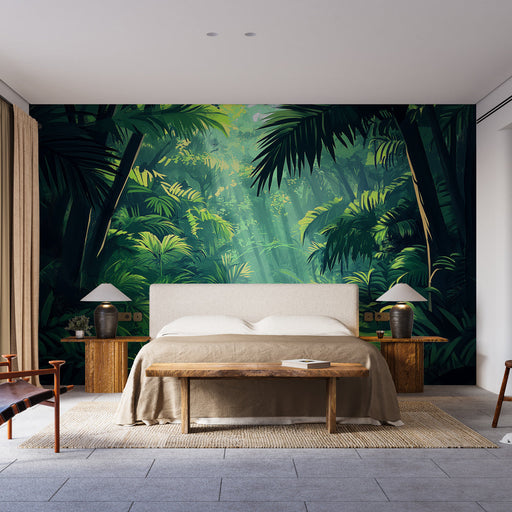 WonderMuralTato tapeta evokuje bujnou džungli, kde se klidná cesta vine mezi hustou vegetací. Paprsky světla pronikají skrz listí, vytvářejíce klidnou a uklid...