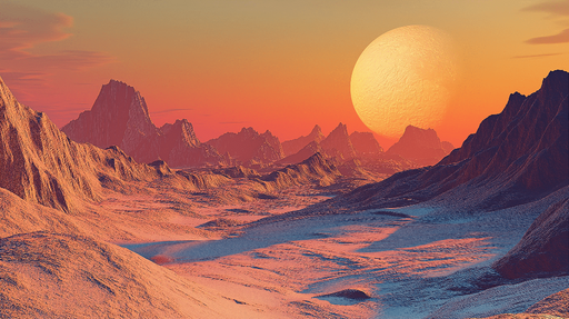 WonderMuralObjevte naši elegantní tapetu zobrazující mimozemskou krajinu, kde se pod nebem s teplými oranžovými a růžovými odstíny tyčí hory s majestátními ob...