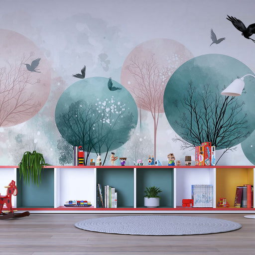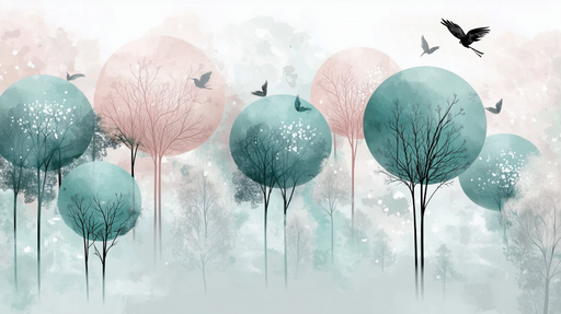 Art'loloTato pastelová přírodní tapeta zachycuje klid očarované krajiny se stylizovanými stromy a siluetami ptáků v letu. Jemné odstíny zelené a růžové vyt...