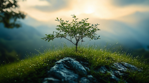 Art'loloTato fototapeta příroda zachycuje klidnou krásu mladého stromu izolovaného na trávnatém vrcholku kopce při východu slunce. Skvělé kapky rosy přidáv...