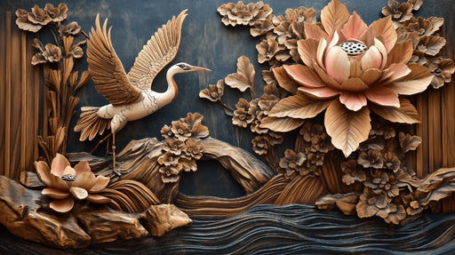 Zobrazit celý detailTapeta přírodního reliéfního zobrazení | Jeřáb a květiny ve reliéfu