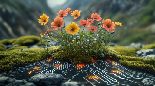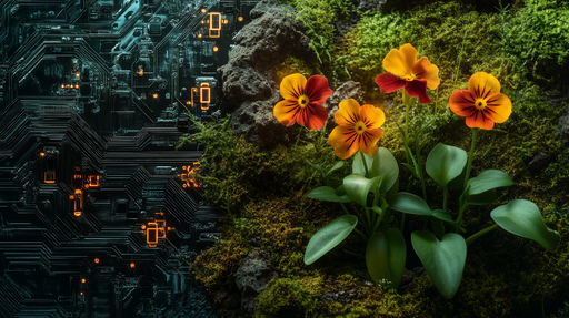 Zobrazit celý detailTapeta s motivem technologie a přírody | Květinová a elektronická harmonie