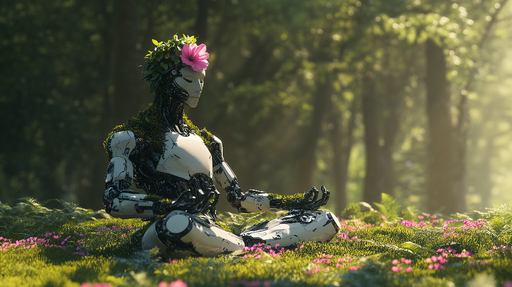 Art'loloObjevte naši robotickou přírodní tapetu, jedinečné spojení technologie a přírodního prostředí. Tento poutavý obrázek zobrazuje robota meditujícího ...