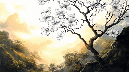 Art'loloObjevte naši tapetu s květinovou krajinou, která zachycuje klidnou krásu přírody s jemnou ilustrací kvetoucího stromu. Jemné a světlé tóny vytvářej...