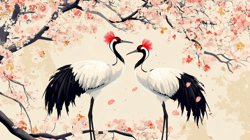 Art'loloTato fototapeta s jeřábem zachycuje přirozenou eleganci jeřábů obklopených jemnými květinovými větvemi. Ideální pro přidání špetky klidu a rafinova...