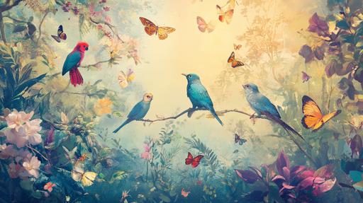 Zobrazit celý detailTapeta s ptáky a motýly | Nádherná přírodní scéna