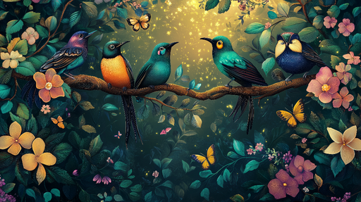 Art'loloTato okouzlující tapeta zobrazuje skupinu jasně barevných ptáků sedících na větvi obklopené motýly a bujnou květinovou hojností. Pozadí evokuje kou...