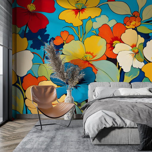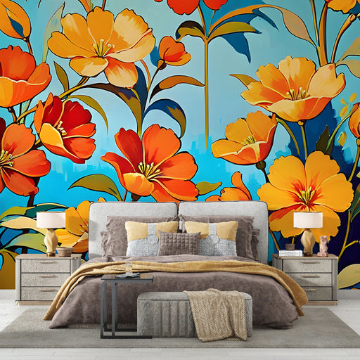 Art'loloOzdobte svůj interiér naší květinovou tapetou s jasnými žlutými a oranžovými květy krásně umístěnými proti živé modré pozadí. Tato květinová stěnov...