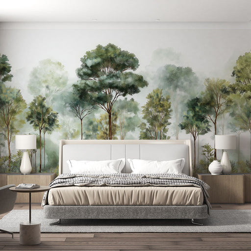 WonderMuralTato tapeta evokuje mlhavý les, kde majestátní stromy jsou načrtnuty v jemných zelených tónech, vytvářející klidnou a mystickou atmosféru. Pozadí s...
