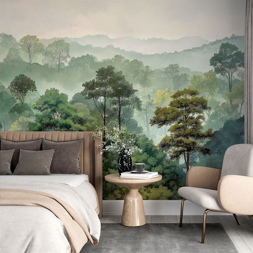 WonderMuralNáš exkluzivní design tapety evokuje uklidňující atmosféru lesa obklopeného mlhou, kde různé odstíny zelené harmonicky splývají a vytvářejí přiroze...