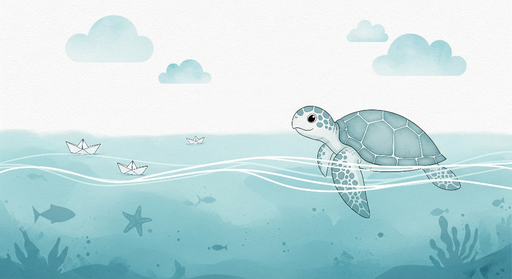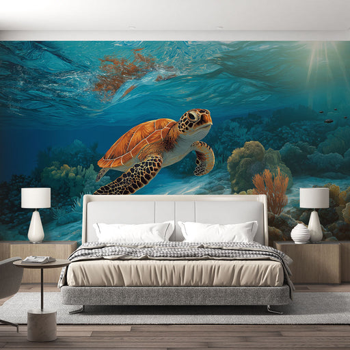 WonderMuralTato tapeta evokuje uklidňující podmořský svět s motivem mořské želvy, která se elegantně pohybuje mezi vlnami. Její jasný a jemný design spolu s d...
