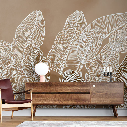 WonderMuralTato tapeta obsahuje elegantní vzor bílých listů jemně ilustrovaných, kontrastujících s pozadím v teplých odstínech hnědé a zlaté. Minimalistická e...