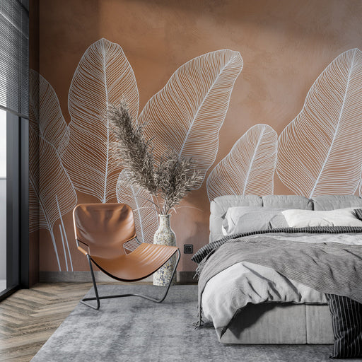 WonderMuralNáš krásný fototapet ukazuje nádherné bílé listy jemně nakreslené na terakotovém pozadí. Kontrast mezi lehkostí listů a teplem pozadí vytváří teplo...