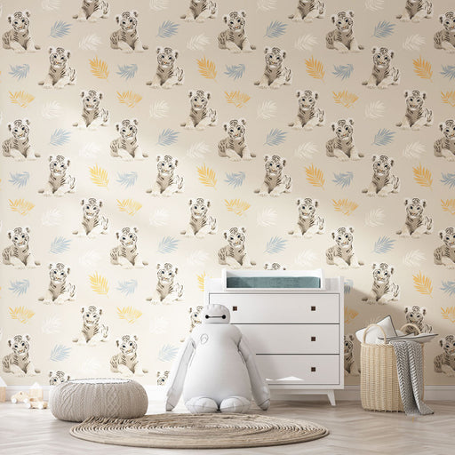 WonderMuralNáš krásný fototapet ukazuje hravé bílé tygří stíny, obklopené jemnými pastelovými listy. Neutrální pozadí umožňuje vzorům rozkvést, přinášející ná...