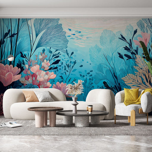 WonderMuralNáš skvělý tapetový mural vyvolává kouzelný vesmír hlubokého moře, s jemným vzorem vodních květin a korálů v odstínech modré, růžové a krému. Tekut...