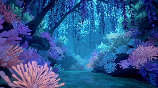 WonderMuralTento fototapet vyvolává kouzelnou podvodní atmosféru s jemnými vzory vodních rostlin a barevných květů plujících v odstínech hluboké modré a růžov...