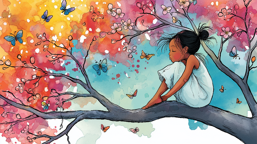 WonderMuralTento okouzlující fototapet zachycuje nevinnost malé dívky sedící na větvi, obklopené krásnými pastelovými květinami a barevnými motýly. Akvarelové...