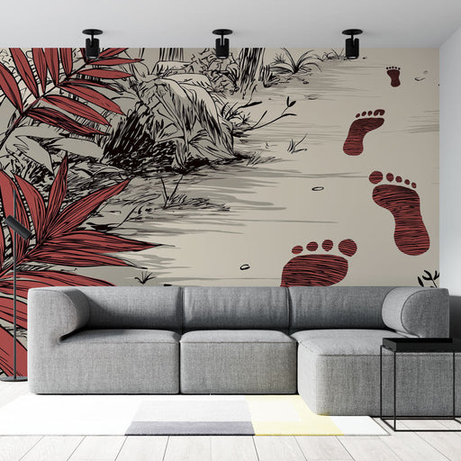 WonderMuralTato jedinečná tapeta s fototapetou má poutavý vzor červených stop na přírodní cestě, rámovaný jemně ilustrovanými tropickými listy. Stopy zdají se...