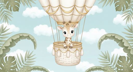 WonderMuralTento okouzlující fototapetový obrázek zobrazuje roztomilou žirafu visící ve horkovzdušném balónu, obklopenou jemnými oblaky a tropickými listy. S ...