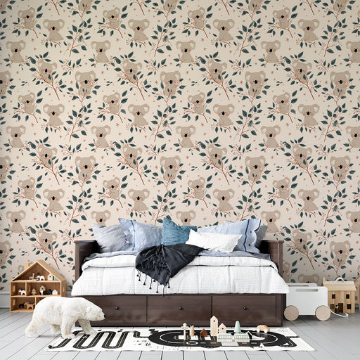WonderMuralObjavte naši roztomile hravou tapetu s koalami na jemném pozadí. Každý koala je obklopen listy a malými květinami, vytvářející radostnou a vítající...