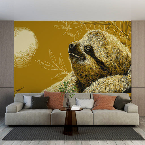 WonderMuralTento okouzlující Fototapet představuje roztomilého lenocha, který se radostně visí na zlatém měsíci, osvětlujícím místnost jemnou a hravou atmosfé...