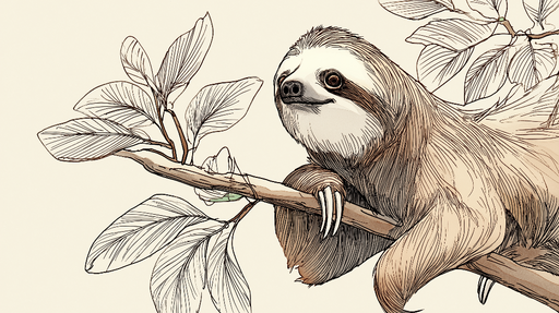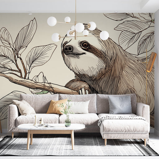 WonderMuralTento tapet zobrazuje uměleckou ilustraci pohodlné lenochoda sedícího na větvi obklopené jemnými zelenými listy. Design evokuje pocit klidu a divok...