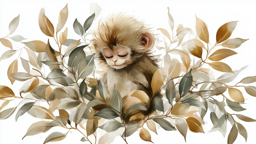 WonderMuralTento okouzlující tapetový mural zobrazuje spící opici jemně integrovanou do zahrady se stylizovanými listy v zemitých tónech. Odstíny béžové, zele...