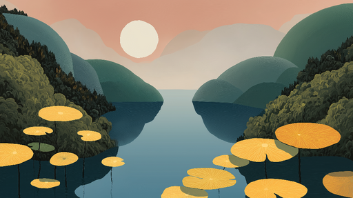 WonderMuralTento tapet zobrazuje krásnou vodní krajinu, ukazující jemné hory, které obklopují klidné jezero. Žluté lekníny elegantně plují na hladině vody, př...