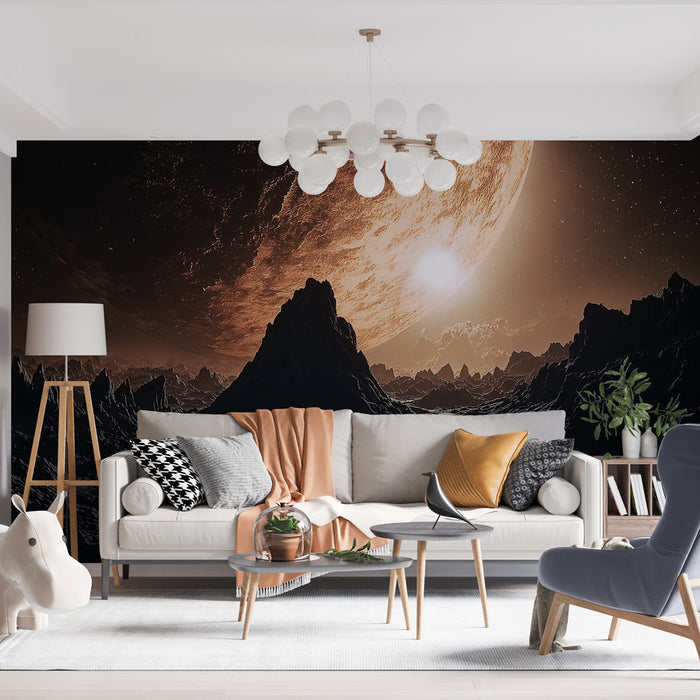 Tato podmanivá tapeta představuje tajemnou lunární krajinu s drsnými horami a velkou planetou, která scénu zalévá jemným světlem. Tmavé odstíny terénu kontrastují s teplou září hvězdy, čímž vytvářejí atmosféru, která je zároveň surrealistická a magická.