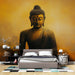 Doplňkové barvy pro tento fototapetový obraz zahrnují neutrální tóny jako bílou, béžovou nebo šedou, které zvýrazní zlaté odstíny, aniž by přehlcovaly prostor. Pro ještě uklidňující efekt zvažte přidání přírodních dřevěných prvků nebo pokojových rostlin.