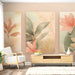 Tento tapet odhaluje krásný soubor květinových vzorů ilustrovaných v jemných odstínech broskvové, zelené a zlaté barvy. Každý panel obsahuje tropické listy a květiny ve vodové malbě, přidávající do vašeho interiéru nádech svěžesti.