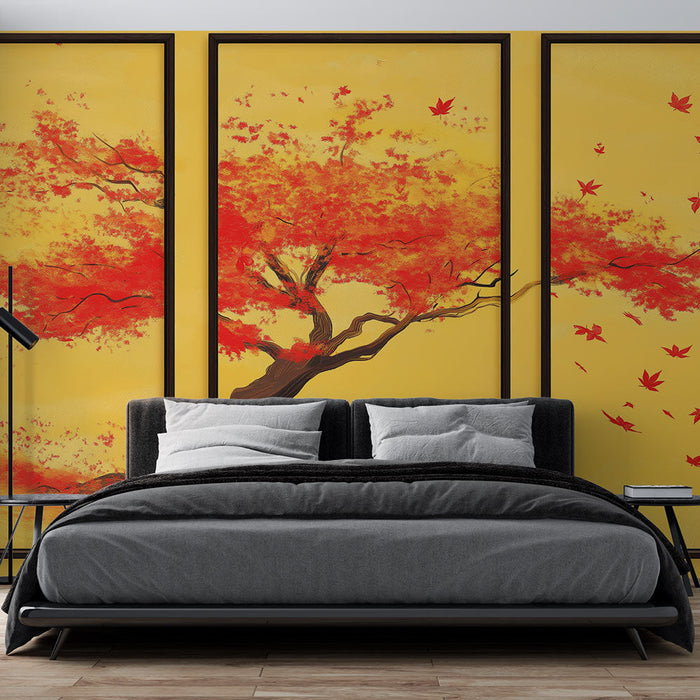 Tapeta s imitací malby podzimního stromu | Nádherná ilustrace stromu s červenými listy na žlutém pozadí