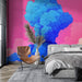 Tato fototapeta představuje živou ilustraci erupující sopky, která vypouští modré oblaky páry do jasně růžové oblohy. Kontrast barev vytváří energickou a dynamickou atmosféru, která je ideální pro odvážné interiéry.