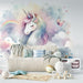 Jemné barvy vodových barev a duha přidávají dotek pohádky do pokoje. Jednorožci, symboly snů a představivosti, jsou zdůrazněny v tomto tapetovém obrazu pro něžnou a barevnou atmosféru.