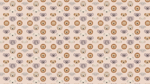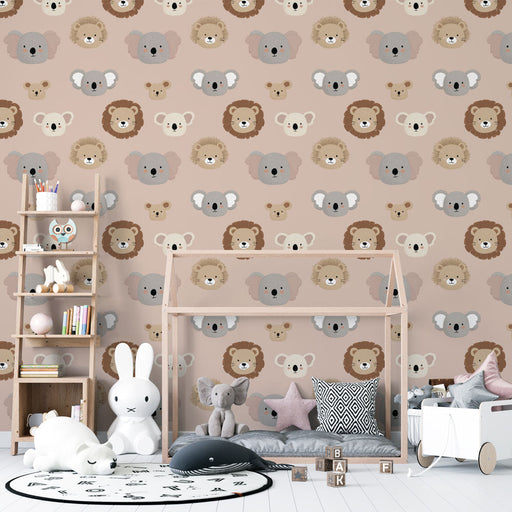 WonderMuralVores tapet viser et sødt mønster af dyrehoveder, herunder løver, elefanter og koalaer, i pastelfarver på en neutral baggrund. Dette legende design...