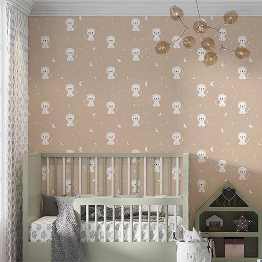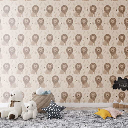 WonderMuralDenne tapet illustrerer søde løver på en blød beige baggrund, prydet med skæve måner og spredte stjerner. Løverne, med deres glade udtryk, skaber e...