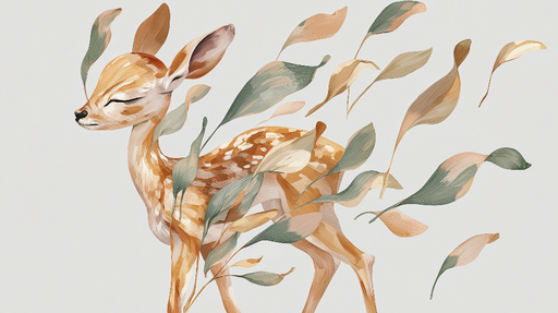 WonderMuralDette fototapet viser en elskværdig hjort med en blød pels og delikate hvide pletter, der trives midt i stiliserede blade i bløde toner. Illustrati...