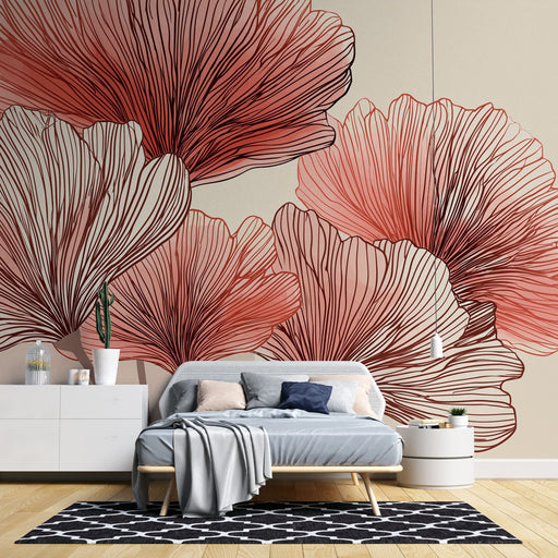 WonderMuralVores fantastiske fototapet tilbyder et charmerende motiv af delikate blomster i koral nuancer, der viser stiliserede sort-hvide illustrationer. De...