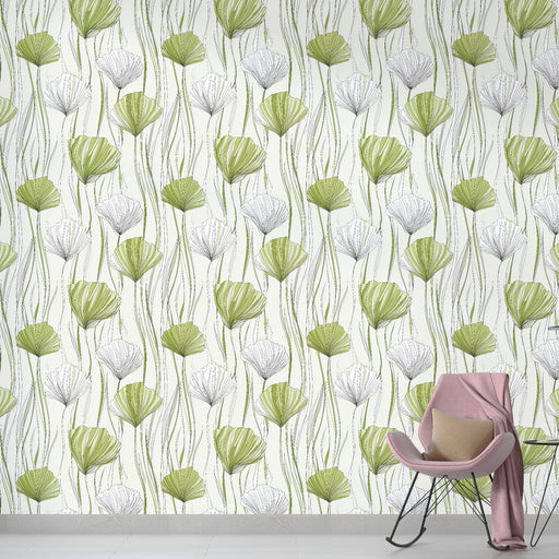 WonderMuralDenne tapet afslører et elegant motiv af stiliserede blomster i delikate nuancer af grønt og hvidt, der fremhæver organiske former og flydende linj...