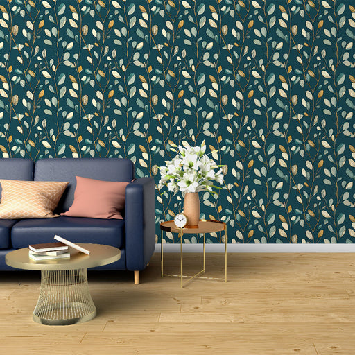 WonderMuralDenne tapet har et lokkende mønster af delikate blade i nuancer af turkis, fløde og guld, der elegant spreder sig over en mørk baggrund. Farveharmo...