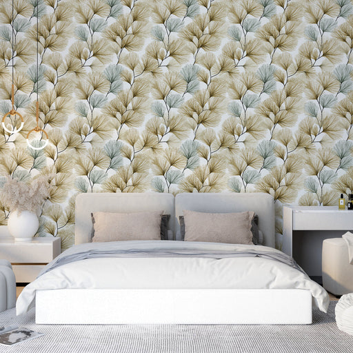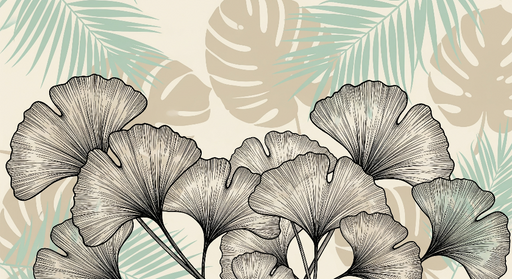 WonderMuralDette unikke fototapet viser et raffineret mønster af ginkgo blade tegnet med præcision, omgivet af delikate palmeblade i bløde toner. Kontrasten m...