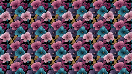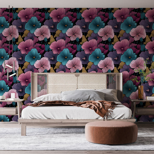 WonderMuralDette Fototapet med blomstermotiv har et levende mønster af blomster i rige toner, der spænder fra lyserød og lilla til turkis, på en sort baggrund...