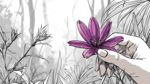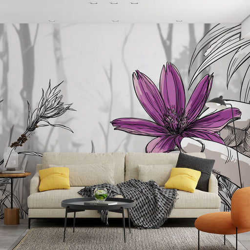 WonderMuralDette fototapet viser en delikat lilla blomst, forsigtigt holdt af en hånd, omgivet af en baggrund af løv, der blomstrer i nuancer af grå. Kunstner...