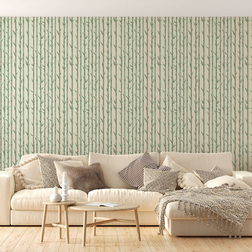 WonderMuralDenne tapet har et elegant bambusmønster med stiliserede grønne stængler og blade på en lys baggrund. Vandfarveprintet giver en blød tekstur, der s...