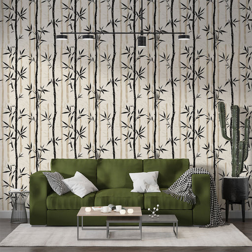 WonderMuralDette fototapet fremhæver et delikat design af bambus, hvor slanke stængler og grønne blade blidt blomstrer på en beroligende flødefarvet baggrund....