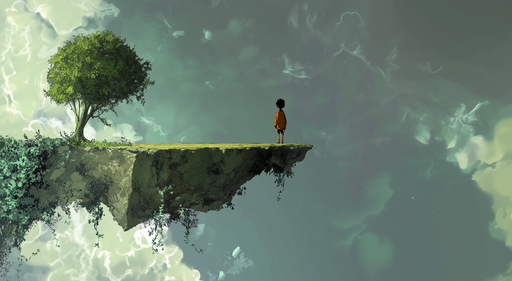 Art'loloDenne kunstneriske tapetmaleri viser et surrealistisk landskab med et barn stående på en forhøjning, omgivet af drømmeagtige skyer. Et frodigt træ ...