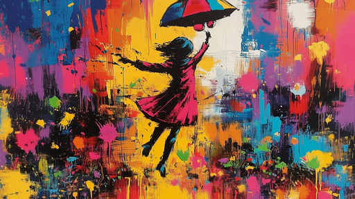 Art'loloDette barnlige fototapet har en glad silhuet af et barn, der holder en farverig paraply midt i en hvirvelvind af livlige nuancer. Eksplosionerne af...